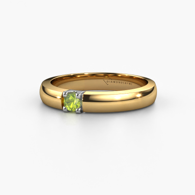 This extraordinary ring is called Rianne 1. This type of ring is known as a memoire ring, because it's birthstones are set in a continuous line. This makes it easy to combine with other rings. The band of this 14 Carat gold ring is set in a combination of peridot and peridot 3 mm. You can easily choose the combination you prefer online. As you can see, a single peridot is set in this single alliance gold ring. The memoire ring represents collaboration. And that is precisely what these gemstones do, collaborate. Together they add a beautiful effect to the band of a classic ring! Such a meaningful ring, wouldn't you agree? All our hand selected peridot are positioned by hand by our expert goldsmith. It's a precise task, which can only be completed successfully through the combination of pure craftsmanship and usage of the latest techniques which give it an optimal effect. To create a perfect reflection of light, all the gemstones have to be perfectly aligned in the same way. During manufacturing, the expert goldsmith will therefore monitor the reflection of light constantly to check whether the peridot are aligned properly. This requires a skilled hand and a lot of patience but then the end product will be a true piece of art. And that is our mission!By using a combination of the latest modern techniques, combined with ancient crafting, we can make all our rings in our own studio. Each jewel is made to order. This is advantageous because we can offer you a price you won't find anywhere else.Our team of talented, passionate designers add new ring designs to our online collection daily. Our objective in doing so, is to be able to offer you a wide variety of jewels. Please feel free to request a quote if you have specific wishes for your ring. We guarantee to make you an offer you can't refuse.To make it easier for you, we offer a 30 day return policy. Check our terms and conditions.
