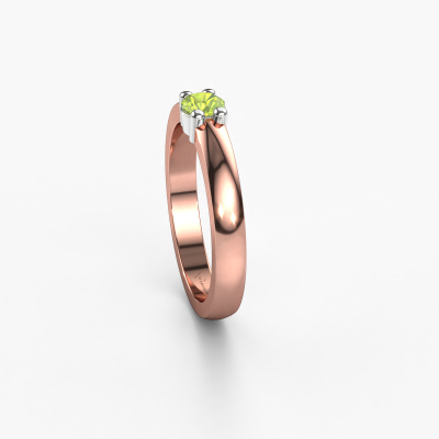 This extraordinary ring is called Yasmin 1. This type of ring is known as a memoire ring, because it's birthstones are set in a continuous line. This makes it easy to combine with other rings. The band of this 14 Carat rose gold ring is set in a combination of peridot and peridot 4 mm. You can easily choose the combination you prefer online. As you can see, a single peridot is set in this single alliance rose gold ring. The memoire ring represents collaboration. And that is precisely what these gemstones do, collaborate. Together they add a beautiful effect to the band of a classic ring! Such a meaningful ring, wouldn't you agree? All our hand selected peridot are positioned by hand by our expert goldsmith. It's a precise task, which can only be completed successfully through the combination of pure craftsmanship and usage of the latest techniques which give it an optimal effect. To create a perfect reflection of light, all the gemstones have to be perfectly aligned in the same way. During manufacturing, the expert goldsmith will therefore monitor the reflection of light constantly to check whether the peridot are aligned properly. This requires a skilled hand and a lot of patience but then the end product will be a true piece of art. And that is our mission!Because we design and deliver our own rings, we can offer you a ring at a price you won't find anywhere else. A ring is made to order, which helps prevent excess supplies, so we can make you a great price offer. We understand it feels risky, buying your ring online, but we will gladly assist in the designing process, taking your budget into consideration.Our team of talented, passionate designers add new ring designs to our online collection daily. Our objective in doing so, is to be able to offer you a wide variety of jewels. Please feel free to request a quote if you have specific wishes for your ring. We guarantee to make you an offer you can't refuse.To make it easier for you, we offer a 30 day return policy. Check our terms and conditions.