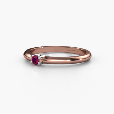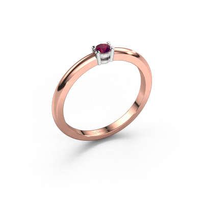 This extraordinary ring is called Michelle 1. This type of ring is known as a memoire ring, because it's birthstones are set in a continuous line. This makes it easy to combine with other rings. The band of this 14 Carat rose gold ring is set in a combination of rhodolite and rhodolite 2.7 mm. You can easily choose the combination you prefer online. As you can see, a single rhodolite is set in this single alliance rose gold ring. The memoire ring represents collaboration. And that is precisely what these gemstones do, collaborate. Together they add a beautiful effect to the band of a classic ring! Such a meaningful ring, wouldn't you agree? All our hand selected rhodolite are positioned by hand by our expert goldsmith. It's a precise task, which can only be completed successfully through the combination of pure craftsmanship and usage of the latest techniques which give it an optimal effect. To create a perfect reflection of light, all the gemstones have to be perfectly aligned in the same way. During manufacturing, the expert goldsmith will therefore monitor the reflection of light constantly to check whether the rhodolite are aligned properly. This requires a skilled hand and a lot of patience but then the end product will be a true piece of art. And that is our mission!By using a combination of the latest modern techniques, combined with ancient crafting, we can make all our rings in our own studio. Each jewel is made to order. This is advantageous because we can offer you a price you won't find anywhere else.
