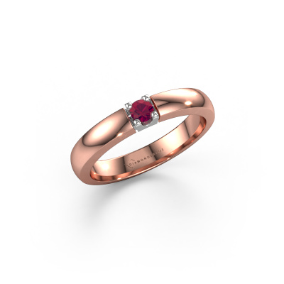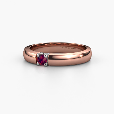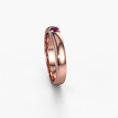 This extraordinary ring is called Rianne 1. This type of ring is known as a memoire ring, because it's birthstones are set in a continuous line. This makes it easy to combine with other rings. The band of this 14 Carat rose gold ring is set in a combination of rhodolite and rhodolite 3 mm. You can easily choose the combination you prefer online. As you can see, a single rhodolite is set in this single alliance rose gold ring. The memoire ring represents collaboration. And that is precisely what these gemstones do, collaborate. Together they add a beautiful effect to the band of a classic ring! Such a meaningful ring, wouldn't you agree? All our hand selected rhodolite are positioned by hand by our expert goldsmith. It's a precise task, which can only be completed successfully through the combination of pure craftsmanship and usage of the latest techniques which give it an optimal effect. To create a perfect reflection of light, all the gemstones have to be perfectly aligned in the same way. During manufacturing, the expert goldsmith will therefore monitor the reflection of light constantly to check whether the rhodolite are aligned properly. This requires a skilled hand and a lot of patience but then the end product will be a true piece of art. And that is our mission!By using a combination of the latest modern techniques, combined with ancient crafting, we can make all our rings in our own studio. Each jewel is made to order. This is advantageous because we can offer you a price you won't find anywhere else.Our team of talented, passionate designers add new ring designs to our online collection daily. Our objective in doing so, is to be able to offer you a wide variety of jewels. Please feel free to request a quote if you have specific wishes for your ring. We guarantee to make you an offer you can't refuse.To make it easier for you, we offer a 30 day return policy. Check our terms and conditions.