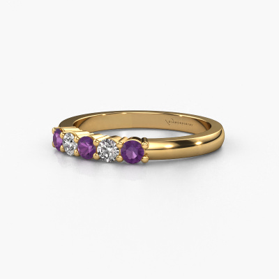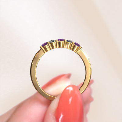 This extraordinary ring is called Yasmin 5. This type of ring is known as a memoire ring, because its gemstones are set in a continuous line. This makes it easy to combine with other rings. The band of this 14 Carat gold ring is set in a combination of amethyst and diamond 3 mm. You can easily choose the combination you prefer online. As you can see, a single amethyst is set in this single alliance gold ring. The memoire ring represents collaboration. And that is precisely what these gemstones do, collaborate. Together they add a beautiful effect to the band of a classic ring! Such a meaningful ring, wouldn't you agree? All our hand selected amethysten are positioned by hand by our expert goldsmith. It's a precise task, which can only be completed successfully through the combination of pure craftsmanship and usage of the latest techniques which give it an optimal effect. To create a perfect reflection of light, all the gemstones have to be perfectly aligned in the same way. During manufacturing, the expert goldsmith will therefore monitor the reflection of light constantly to check whether the amethysten are aligned properly. This requires a skilled hand and a lot of patience but then the end product will be a true piece of art. And that is our mission!After receiving your order, our goldsmiths will passionately start the creative process of making your ring in our own studio. Because we don't have a big stockpile, these costs will not be passed on to you. Our pricing is proof of that! We offer top quality jewels at lowest price, guaranteed.Our talented designers add new designs to our online collection daily. Together they create a diverse collection of the finest jewellery. If you prefer to make a ring according your own design, please feel free to request a quote. We will make you an amazing offer, based on quality and price.To make it easier for you, we offer a 30 day return policy. Check our terms and conditions.