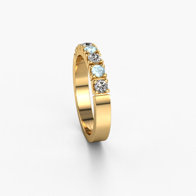 This extraordinary ring is called Dana 7. This type of ring is known as a memoire ring, because its gemstones are set in a continuous line. This makes it easy to combine with other rings. The band of this 14 Carat gold ring is set in a combination of aquamarine and lab grown diamond 3 mm. You can easily choose the combination you prefer online. As you can see, a single aquamarine is set in this single alliance gold ring. The memoire ring represents collaboration. And that is precisely what these gemstones do, collaborate. Together they add a beautiful effect to the band of a modern ring! Such a meaningful ring, wouldn't you agree? All our hand selected aquamarine are positioned by hand by our expert goldsmith. It's a precise task, which can only be completed successfully through the combination of pure craftsmanship and usage of the latest techniques which give it an optimal effect. To create a perfect reflection of light, all the gemstones have to be perfectly aligned in the same way. During manufacturing, the expert goldsmith will therefore monitor the reflection of light constantly to check whether the aquamarine are aligned properly. This requires a skilled hand and a lot of patience but then the end product will be a true piece of art. And that is our mission!After receiving your order, our goldsmiths will passionately start the creative process of making your ring in our own studio. Because we don't have a big stockpile, these costs will not be passed on to you. Our pricing is proof of that! We offer top quality jewels at lowest price, guaranteed.Our team of talented, passionate designers add new ring designs to our online collection daily. Our objective in doing so, is to be able to offer you a wide variety of jewels. Please feel free to request a quote if you have specific wishes for your ring. We guarantee to make you an offer you can't refuse.To make it easier for you, we offer a 30 day return policy. Check our terms and conditions.