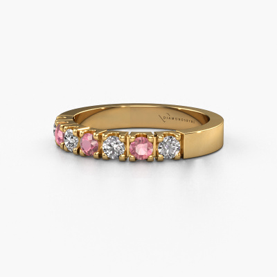 This extraordinary ring is called Dana 7. This type of ring is known as a memoire ring, because its gemstones are set in a continuous line. This makes it easy to combine with other rings. The band of this 14 Carat gold ring is set in a combination of tourmaline pink and lab grown diamond 3 mm. You can easily choose the combination you prefer online. As you can see, a single tourmaline pink is set in this single alliance gold ring. The memoire ring represents collaboration. And that is precisely what these gemstones do, collaborate. Together they add a beautiful effect to the band of a modern ring! Such a meaningful ring, wouldn't you agree? All our hand selected tourmaline pink are positioned by hand by our expert goldsmith. It's a precise task, which can only be completed successfully through the combination of pure craftsmanship and usage of the latest techniques which give it an optimal effect. To create a perfect reflection of light, all the gemstones have to be perfectly aligned in the same way. During manufacturing, the expert goldsmith will therefore monitor the reflection of light constantly to check whether the tourmaline pink are aligned properly. This requires a skilled hand and a lot of patience but then the end product will be a true piece of art. And that is our mission!After receiving your order, our goldsmiths will passionately start the creative process of making your ring in our own studio. Because we don't have a big stockpile, these costs will not be passed on to you. Our pricing is proof of that! We offer top quality jewels at lowest price, guaranteed.Our team of talented, passionate designers add new ring designs to our online collection daily. Our objective in doing so, is to be able to offer you a wide variety of jewels. Please feel free to request a quote if you have specific wishes for your ring. We guarantee to make you an offer you can't refuse.To make it easier for you, we offer a 30 day return policy. Check our terms and conditions.