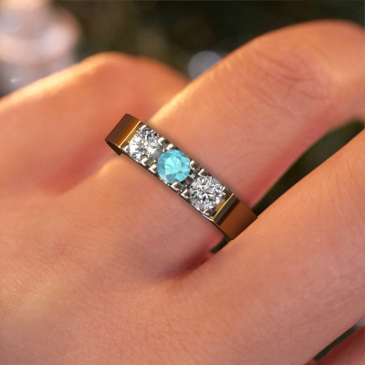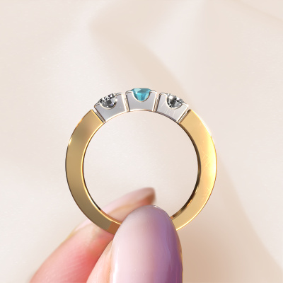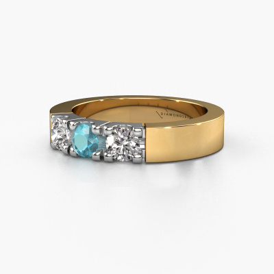 This extraordinary ring is called Dana 3. This type of ring is known as a memoire ring, because its gemstones are set in a continuous line. This makes it easy to combine with other rings. The band of this 14 Carat gold ring is set in a combination of blue topaz and lab grown diamond 4 mm. You can easily choose the combination you prefer online. As you can see, a single blue topaz is set in this single alliance gold ring. The memoire ring represents collaboration. And that is precisely what these gemstones do, collaborate. Together they add a beautiful effect to the band of a modern ring! Such a meaningful ring, wouldn't you agree? All our hand selected blue topaz are positioned by hand by our expert goldsmith. It's a precise task, which can only be completed successfully through the combination of pure craftsmanship and usage of the latest techniques which give it an optimal effect. To create a perfect reflection of light, all the gemstones have to be perfectly aligned in the same way. During manufacturing, the expert goldsmith will therefore monitor the reflection of light constantly to check whether the blue topaz are aligned properly. This requires a skilled hand and a lot of patience but then the end product will be a true piece of art. And that is our mission!After receiving your order, our goldsmiths will passionately start the creative process of making your ring in our own studio. Because we don't have a big stockpile, these costs will not be passed on to you. Our pricing is proof of that! We offer top quality jewels at lowest price, guaranteed.Our talented designers add new designs to our online collection daily. Together they create a diverse collection of the finest jewellery. If you prefer to make a ring according your own design, please feel free to request a quote. We will make you an amazing offer, based on quality and price.To make it easier for you, we offer a 30 day return policy. Check our terms and conditions.
