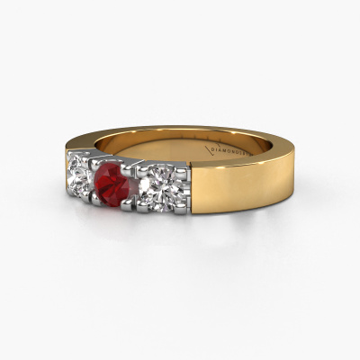 This extraordinary ring is called Dana 3. This type of ring is known as a memoire ring, because its gemstones are set in a continuous line. This makes it easy to combine with other rings. The band of this 14 Carat gold ring is set in a combination of ruby and lab grown diamond 4 mm. You can easily choose the combination you prefer online. As you can see, a single ruby is set in this single alliance gold ring. The memoire ring represents collaboration. And that is precisely what these gemstones do, collaborate. Together they add a beautiful effect to the band of a modern ring! Such a meaningful ring, wouldn't you agree? All our hand selected ruby are positioned by hand by our expert goldsmith. It's a precise task, which can only be completed successfully through the combination of pure craftsmanship and usage of the latest techniques which give it an optimal effect. To create a perfect reflection of light, all the gemstones have to be perfectly aligned in the same way. During manufacturing, the expert goldsmith will therefore monitor the reflection of light constantly to check whether the ruby are aligned properly. This requires a skilled hand and a lot of patience but then the end product will be a true piece of art. And that is our mission!After receiving your order, our goldsmiths will passionately start the creative process of making your ring in our own studio. Because we don't have a big stockpile, these costs will not be passed on to you. Our pricing is proof of that! We offer top quality jewels at lowest price, guaranteed.Our talented designers add new designs to our online collection daily. Together they create a diverse collection of the finest jewellery. If you prefer to make a ring according your own design, please feel free to request a quote. We will make you an amazing offer, based on quality and price.To make it easier for you, we offer a 30 day return policy. Check our terms and conditions.