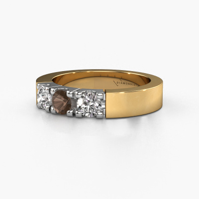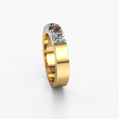 This extraordinary ring is called Dana 3. This type of ring is known as a memoire ring, because its gemstones are set in a continuous line. This makes it easy to combine with other rings. The band of this 14 Carat gold ring is set in a combination of smokey quartz and lab grown diamond 4 mm. You can easily choose the combination you prefer online. As you can see, a single smokey quartz is set in this single alliance gold ring. The memoire ring represents collaboration. And that is precisely what these gemstones do, collaborate. Together they add a beautiful effect to the band of a modern ring! Such a meaningful ring, wouldn't you agree? All our hand selected smokey quartz are positioned by hand by our expert goldsmith. It's a precise task, which can only be completed successfully through the combination of pure craftsmanship and usage of the latest techniques which give it an optimal effect. To create a perfect reflection of light, all the gemstones have to be perfectly aligned in the same way. During manufacturing, the expert goldsmith will therefore monitor the reflection of light constantly to check whether the smokey quartz are aligned properly. This requires a skilled hand and a lot of patience but then the end product will be a true piece of art. And that is our mission!After receiving your order, our goldsmiths will passionately start the creative process of making your ring in our own studio. Because we don't have a big stockpile, these costs will not be passed on to you. Our pricing is proof of that! We offer top quality jewels at lowest price, guaranteed.Our talented designers add new designs to our online collection daily. Together they create a diverse collection of the finest jewellery. If you prefer to make a ring according your own design, please feel free to request a quote. We will make you an amazing offer, based on quality and price.To make it easier for you, we offer a 30 day return policy. Check our terms and conditions.