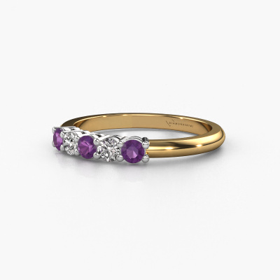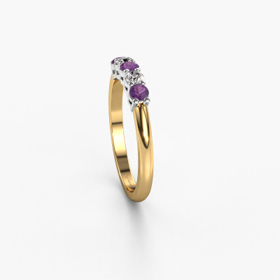This extraordinary ring is called Michelle 5. This type of ring is known as a memoire ring, because its gemstones are set in a continuous line. This makes it easy to combine with other rings. The band of this 14 Carat gold ring is set in a combination of amethyst and lab grown diamond 3 mm. You can easily choose the combination you prefer online. As you can see, a single amethyst is set in this single alliance gold ring. The memoire ring represents collaboration. And that is precisely what these gemstones do, collaborate. Together they add a beautiful effect to the band of a classic ring! Such a meaningful ring, wouldn't you agree? All our hand selected amethysten are positioned by hand by our expert goldsmith. It's a precise task, which can only be completed successfully through the combination of pure craftsmanship and usage of the latest techniques which give it an optimal effect. To create a perfect reflection of light, all the gemstones have to be perfectly aligned in the same way. During manufacturing, the expert goldsmith will therefore monitor the reflection of light constantly to check whether the amethysten are aligned properly. This requires a skilled hand and a lot of patience but then the end product will be a true piece of art. And that is our mission!Are you on a budget? Please feel free to contact us, so we can go discuss your options. We offer our rings at guaranteed best price, because we make them to order. You won't find such a price anywhere else!