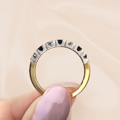 This extraordinary ring is called Rianne 7. This type of ring is known as a memoire ring, because its gemstones are set in a continuous line. This makes it easy to combine with other rings. The band of this 14 Carat gold ring is set in a combination of black diamond and lab grown diamond 0.76 crt. You can easily choose the combination you prefer online. As you can see, a single black diamond is set in this single alliance gold ring. The memoire ring represents collaboration. And that is precisely what these gemstones do, collaborate. Together they add a beautiful effect to the band of a traditional ring! Such a meaningful ring, wouldn't you agree? All our hand selected black diamonds are positioned by hand by our expert goldsmith. It's a precise task, which can only be completed successfully through the combination of pure craftsmanship and usage of the latest techniques which give it an optimal effect. To create a perfect reflection of light, all the gemstones have to be perfectly aligned in the same way. During manufacturing, the expert goldsmith will therefore monitor the reflection of light constantly to check whether the black diamonds are aligned properly. This requires a skilled hand and a lot of patience but then the end product will be a true piece of art. And that is our mission!Because we design and deliver our own rings, we can offer you a ring at a price you won't find anywhere else. A ring is made to order, which helps prevent excess supplies, so we can make you a great price offer. We understand it feels risky, buying your ring online, but we will gladly assist in the designing process, taking your budget into consideration.