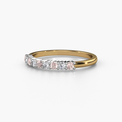 This extraordinary ring is called Yasmin 9. This type of ring is known as a memoire ring, because its gemstones are set in a continuous line. This makes it easy to combine with other rings. The band of this 14 Carat gold ring is set in a combination of morganite champagne and diamond 2.4 mm. You can easily choose the combination you prefer online. As you can see, a single morganite champagne is set in this single alliance gold ring. The memoire ring represents collaboration. And that is precisely what these gemstones do, collaborate. Together they add a beautiful effect to the band of a classic ring! Such a meaningful ring, wouldn't you agree? All our hand selected morganite champagne are positioned by hand by our expert goldsmith. It's a precise task, which can only be completed successfully through the combination of pure craftsmanship and usage of the latest techniques which give it an optimal effect. To create a perfect reflection of light, all the gemstones have to be perfectly aligned in the same way. During manufacturing, the expert goldsmith will therefore monitor the reflection of light constantly to check whether the morganite champagne are aligned properly. This requires a skilled hand and a lot of patience but then the end product will be a true piece of art. And that is our mission!