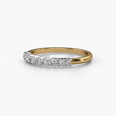 This extraordinary ring is called Yasmin 9. This type of ring is known as a memoire ring, because its gemstones are set in a continuous line. This makes it easy to combine with other rings. The band of this 14 Carat gold ring is set in a combination of zirconia and diamond 2.4 mm. You can easily choose the combination you prefer online. As you can see, a single zirconia is set in this single alliance gold ring. The memoire ring represents collaboration. And that is precisely what these gemstones do, collaborate. Together they add a beautiful effect to the band of a classic ring! Such a meaningful ring, wouldn't you agree? All our hand selected cz-stones are positioned by hand by our expert goldsmith. It's a precise task, which can only be completed successfully through the combination of pure craftsmanship and usage of the latest techniques which give it an optimal effect. To create a perfect reflection of light, all the gemstones have to be perfectly aligned in the same way. During manufacturing, the expert goldsmith will therefore monitor the reflection of light constantly to check whether the cz-stones are aligned properly. This requires a skilled hand and a lot of patience but then the end product will be a true piece of art. And that is our mission!By using a combination of the latest modern techniques, combined with ancient crafting, we can make all our rings in our own studio. Each jewel is made to order. This is advantageous because we can offer you a price you won't find anywhere else.Our team of talented, passionate designers add new ring designs to our online collection daily. Our objective in doing so, is to be able to offer you a wide variety of jewels. Please feel free to request a quote if you have specific wishes for your ring. We guarantee to make you an offer you can't refuse.To make it easier for you, we offer a 30 day return policy. Check our terms and conditions.