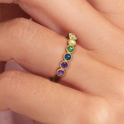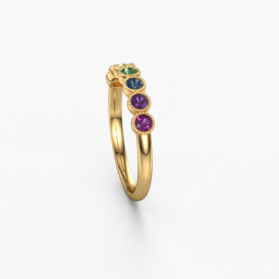 This extraordinary ring is called Mariam half. This type of ring is known as a memoire ring, because it's birthstones are set in a continuous line. This makes it easy to combine with other rings. The band of this 14 Carat gold ring is set in a combination of Rainbow sapphire 1 and Rainbow sapphire 1 2.4 mm. You can easily choose the combination you prefer online. As you can see, a single Rainbow sapphire 1 is set in this single alliance gold ring. The memoire ring represents collaboration. And that is precisely what these gemstones do, collaborate. Together they add a beautiful effect to the band of a fantasy ring! Such a meaningful ring, wouldn't you agree? All our hand selected Rainbow sapphire 1 are positioned by hand by our expert goldsmith. It's a precise task, which can only be completed successfully through the combination of pure craftsmanship and usage of the latest techniques which give it an optimal effect. To create a perfect reflection of light, all the gemstones have to be perfectly aligned in the same way. During manufacturing, the expert goldsmith will therefore monitor the reflection of light constantly to check whether the Rainbow sapphire 1 are aligned properly. This requires a skilled hand and a lot of patience but then the end product will be a true piece of art. And that is our mission!Are you on a budget? Please feel free to contact us, so we can go discuss your options. We offer our rings at guaranteed best price, because we make them to order. You won't find such a price anywhere else!