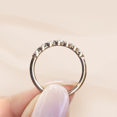 This extraordinary ring is called Mariam half. This type of ring is known as a memoire ring, because it's birthstones are set in a continuous line. This makes it easy to combine with other rings. The band of this platinum ring is set in a