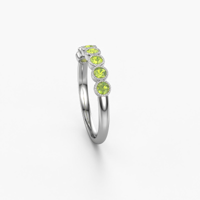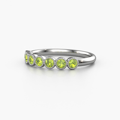 This extraordinary ring is called Mariam half. This type of ring is known as a memoire ring, because it's birthstones are set in a continuous line. This makes it easy to combine with other rings. The band of this platinum ring is set in a combination of peridot and peridot 2.4 mm. You can easily choose the combination you prefer online. As you can see, a single peridot is set in this single alliance platinum ring. The memoire ring represents collaboration. And that is precisely what these gemstones do, collaborate. Together they add a beautiful effect to the band of a fantasy ring! Such a meaningful ring, wouldn't you agree? All our hand selected peridot are positioned by hand by our expert goldsmith. It's a precise task, which can only be completed successfully through the combination of pure craftsmanship and usage of the latest techniques which give it an optimal effect. To create a perfect reflection of light, all the gemstones have to be perfectly aligned in the same way. During manufacturing, the expert goldsmith will therefore monitor the reflection of light constantly to check whether the peridot are aligned properly. This requires a skilled hand and a lot of patience but then the end product will be a true piece of art. And that is our mission!Are you on a budget? Please feel free to contact us, so we can go discuss your options. We offer our rings at guaranteed best price, because we make them to order. You won't find such a price anywhere else!