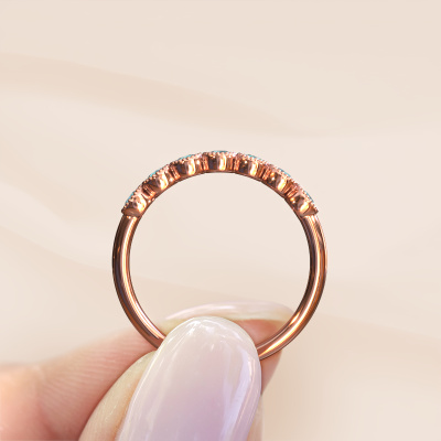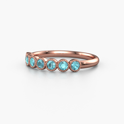 This extraordinary ring is called Mariam half. This type of ring is known as a memoire ring, because it's birthstones are set in a continuous line. This makes it easy to combine with other rings. The band of this 14 Carat rose gold ring is set in a combination of blue topaz and blue topaz 2.4 mm. You can easily choose the combination you prefer online. As you can see, a single blue topaz is set in this single alliance rose gold ring. The memoire ring represents collaboration. And that is precisely what these gemstones do, collaborate. Together they add a beautiful effect to the band of a fantasy ring! Such a meaningful ring, wouldn't you agree? All our hand selected blue topaz are positioned by hand by our expert goldsmith. It's a precise task, which can only be completed successfully through the combination of pure craftsmanship and usage of the latest techniques which give it an optimal effect. To create a perfect reflection of light, all the gemstones have to be perfectly aligned in the same way. During manufacturing, the expert goldsmith will therefore monitor the reflection of light constantly to check whether the blue topaz are aligned properly. This requires a skilled hand and a lot of patience but then the end product will be a true piece of art. And that is our mission!Are you on a budget? Please feel free to contact us, so we can go discuss your options. We offer our rings at guaranteed best price, because we make them to order. You won't find such a price anywhere else!