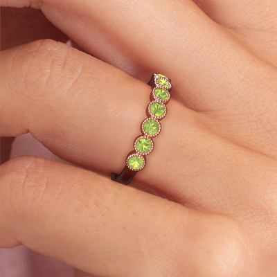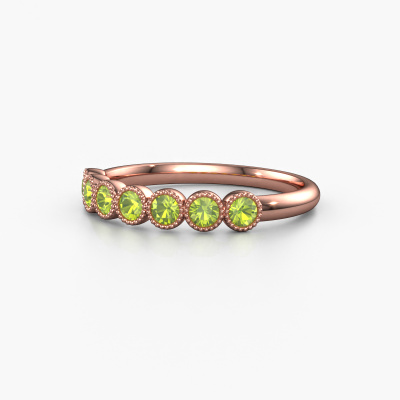 This extraordinary ring is called Mariam half. This type of ring is known as a memoire ring, because it's birthstones are set in a continuous line. This makes it easy to combine with other rings. The band of this 14 Carat rose gold ring is set in a combination of peridot and peridot 2.4 mm. You can easily choose the combination you prefer online. As you can see, a single peridot is set in this single alliance rose gold ring. The memoire ring represents collaboration. And that is precisely what these gemstones do, collaborate. Together they add a beautiful effect to the band of a fantasy ring! Such a meaningful ring, wouldn't you agree? All our hand selected peridot are positioned by hand by our expert goldsmith. It's a precise task, which can only be completed successfully through the combination of pure craftsmanship and usage of the latest techniques which give it an optimal effect. To create a perfect reflection of light, all the gemstones have to be perfectly aligned in the same way. During manufacturing, the expert goldsmith will therefore monitor the reflection of light constantly to check whether the peridot are aligned properly. This requires a skilled hand and a lot of patience but then the end product will be a true piece of art. And that is our mission!Are you on a budget? Please feel free to contact us, so we can go discuss your options. We offer our rings at guaranteed best price, because we make them to order. You won't find such a price anywhere else!