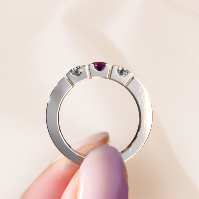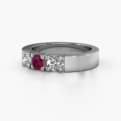 This extraordinary ring is called Dana 3. This type of ring is known as a memoire ring, because its gemstones are set in a continuous line. This makes it easy to combine with other rings. The band of this platinum ring is set in a combination of rhodolite and lab grown diamond 4 mm. You can easily choose the combination you prefer online. As you can see, a single rhodolite is set in this single alliance platinum ring. The memoire ring represents collaboration. And that is precisely what these gemstones do, collaborate. Together they add a beautiful effect to the band of a modern ring! Such a meaningful ring, wouldn't you agree? All our hand selected rhodolite are positioned by hand by our expert goldsmith. It's a precise task, which can only be completed successfully through the combination of pure craftsmanship and usage of the latest techniques which give it an optimal effect. To create a perfect reflection of light, all the gemstones have to be perfectly aligned in the same way. During manufacturing, the expert goldsmith will therefore monitor the reflection of light constantly to check whether the rhodolite are aligned properly. This requires a skilled hand and a lot of patience but then the end product will be a true piece of art. And that is our mission!After receiving your order, our goldsmiths will passionately start the creative process of making your ring in our own studio. Because we don't have a big stockpile, these costs will not be passed on to you. Our pricing is proof of that! We offer top quality jewels at lowest price, guaranteed.Our talented designers add new designs to our online collection daily. Together they create a diverse collection of the finest jewellery. If you prefer to make a ring according your own design, please feel free to request a quote. We will make you an amazing offer, based on quality and price.To make it easier for you, we offer a 30 day return policy. Check our terms and conditions.