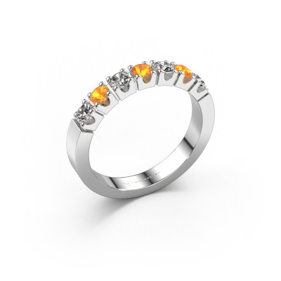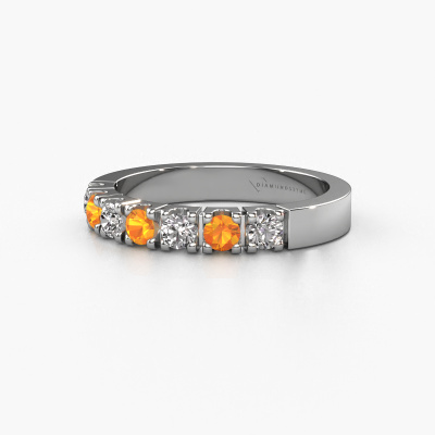 This extraordinary ring is called Dana 7. This type of ring is known as a memoire ring, because its gemstones are set in a continuous line. This makes it easy to combine with other rings. The band of this platinum ring is set in a combination of citrin and lab grown diamond 3 mm. You can easily choose the combination you prefer online. As you can see, a single citrin is set in this single alliance platinum ring. The memoire ring represents collaboration. And that is precisely what these gemstones do, collaborate. Together they add a beautiful effect to the band of a modern ring! Such a meaningful ring, wouldn't you agree? All our hand selected citrin are positioned by hand by our expert goldsmith. It's a precise task, which can only be completed successfully through the combination of pure craftsmanship and usage of the latest techniques which give it an optimal effect. To create a perfect reflection of light, all the gemstones have to be perfectly aligned in the same way. During manufacturing, the expert goldsmith will therefore monitor the reflection of light constantly to check whether the citrin are aligned properly. This requires a skilled hand and a lot of patience but then the end product will be a true piece of art. And that is our mission!After receiving your order, our goldsmiths will passionately start the creative process of making your ring in our own studio. Because we don't have a big stockpile, these costs will not be passed on to you. Our pricing is proof of that! We offer top quality jewels at lowest price, guaranteed.Our team of talented, passionate designers add new ring designs to our online collection daily. Our objective in doing so, is to be able to offer you a wide variety of jewels. Please feel free to request a quote if you have specific wishes for your ring. We guarantee to make you an offer you can't refuse.To make it easier for you, we offer a 30 day return policy. Check our terms and conditions.