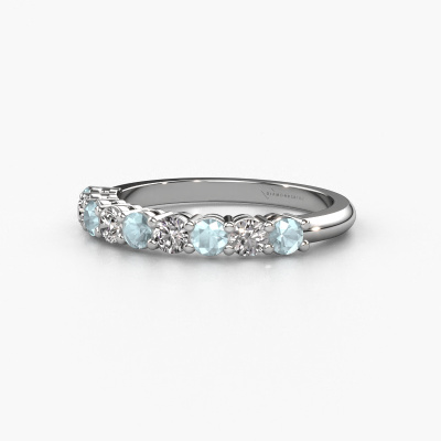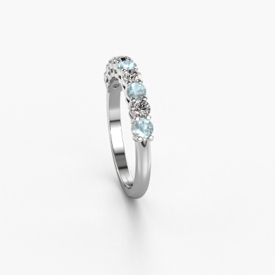 This extraordinary ring is called Michelle 9. This type of ring is known as a memoire ring, because its gemstones are set in a continuous line. This makes it easy to combine with other rings. The band of this platinum ring is set in a combination of aquamarine and lab grown diamond 2.7 mm. You can easily choose the combination you prefer online. As you can see, a single aquamarine is set in this single alliance platinum ring. The memoire ring represents collaboration. And that is precisely what these gemstones do, collaborate. Together they add a beautiful effect to the band of a classic ring! Such a meaningful ring, wouldn't you agree? All our hand selected aquamarine are positioned by hand by our expert goldsmith. It's a precise task, which can only be completed successfully through the combination of pure craftsmanship and usage of the latest techniques which give it an optimal effect. To create a perfect reflection of light, all the gemstones have to be perfectly aligned in the same way. During manufacturing, the expert goldsmith will therefore monitor the reflection of light constantly to check whether the aquamarine are aligned properly. This requires a skilled hand and a lot of patience but then the end product will be a true piece of art. And that is our mission!Because we design and deliver our own rings, we can offer you a ring at a price you won't find anywhere else. A ring is made to order, which helps prevent excess supplies, so we can make you a great price offer. We understand it feels risky, buying your ring online, but we will gladly assist in the designing process, taking your budget into consideration.Our team of talented, passionate designers add new ring designs to our online collection daily. Our objective in doing so, is to be able to offer you a wide variety of jewels. Please feel free to request a quote if you have specific wishes for your ring. We guarantee to make you an offer you can't refuse.To make it easier for you, we offer a 30 day return policy. Check our terms and conditions.