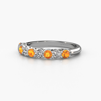 This extraordinary ring is called Michelle 9. This type of ring is known as a memoire ring, because its gemstones are set in a continuous line. This makes it easy to combine with other rings. The band of this platinum ring is set in a combination of citrin and lab grown diamond 2.7 mm. You can easily choose the combination you prefer online. As you can see, a single citrin is set in this single alliance platinum ring. The memoire ring represents collaboration. And that is precisely what these gemstones do, collaborate. Together they add a beautiful effect to the band of a classic ring! Such a meaningful ring, wouldn't you agree? All our hand selected citrin are positioned by hand by our expert goldsmith. It's a precise task, which can only be completed successfully through the combination of pure craftsmanship and usage of the latest techniques which give it an optimal effect. To create a perfect reflection of light, all the gemstones have to be perfectly aligned in the same way. During manufacturing, the expert goldsmith will therefore monitor the reflection of light constantly to check whether the citrin are aligned properly. This requires a skilled hand and a lot of patience but then the end product will be a true piece of art. And that is our mission!Because we design and deliver our own rings, we can offer you a ring at a price you won't find anywhere else. A ring is made to order, which helps prevent excess supplies, so we can make you a great price offer. We understand it feels risky, buying your ring online, but we will gladly assist in the designing process, taking your budget into consideration.Our team of talented, passionate designers add new ring designs to our online collection daily. Our objective in doing so, is to be able to offer you a wide variety of jewels. Please feel free to request a quote if you have specific wishes for your ring. We guarantee to make you an offer you can't refuse.To make it easier for you, we offer a 30 day return policy. Check our terms and conditions.