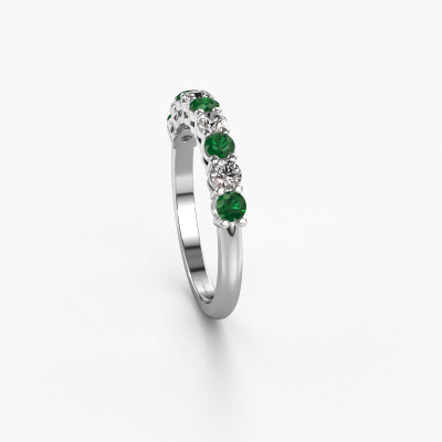 This extraordinary ring is called Michelle 9. This type of ring is known as a memoire ring, because its gemstones are set in a continuous line. This makes it easy to combine with other rings. The band of this platinum ring is set in a combination of emerald and lab grown diamond 2.7 mm. You can easily choose the combination you prefer online. As you can see, a single emerald is set in this single alliance platinum ring. The memoire ring represents collaboration. And that is precisely what these gemstones do, collaborate. Together they add a beautiful effect to the band of a classic ring! Such a meaningful ring, wouldn't you agree? All our hand selected emerald are positioned by hand by our expert goldsmith. It's a precise task, which can only be completed successfully through the combination of pure craftsmanship and usage of the latest techniques which give it an optimal effect. To create a perfect reflection of light, all the gemstones have to be perfectly aligned in the same way. During manufacturing, the expert goldsmith will therefore monitor the reflection of light constantly to check whether the emerald are aligned properly. This requires a skilled hand and a lot of patience but then the end product will be a true piece of art. And that is our mission!Because we design and deliver our own rings, we can offer you a ring at a price you won't find anywhere else. A ring is made to order, which helps prevent excess supplies, so we can make you a great price offer. We understand it feels risky, buying your ring online, but we will gladly assist in the designing process, taking your budget into consideration.Our team of talented, passionate designers add new ring designs to our online collection daily. Our objective in doing so, is to be able to offer you a wide variety of jewels. Please feel free to request a quote if you have specific wishes for your ring. We guarantee to make you an offer you can't refuse.To make it easier for you, we offer a 30 day return policy. Check our terms and conditions.