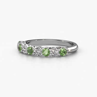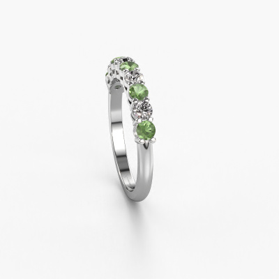 This extraordinary ring is called Michelle 9. This type of ring is known as a memoire ring, because its gemstones are set in a continuous line. This makes it easy to combine with other rings. The band of this platinum ring is set in a combination of tourmaline green and lab grown diamond 2.7 mm. You can easily choose the combination you prefer online. As you can see, a single tourmaline green is set in this single alliance platinum ring. The memoire ring represents collaboration. And that is precisely what these gemstones do, collaborate. Together they add a beautiful effect to the band of a classic ring! Such a meaningful ring, wouldn't you agree? All our hand selected tourmaline green are positioned by hand by our expert goldsmith. It's a precise task, which can only be completed successfully through the combination of pure craftsmanship and usage of the latest techniques which give it an optimal effect. To create a perfect reflection of light, all the gemstones have to be perfectly aligned in the same way. During manufacturing, the expert goldsmith will therefore monitor the reflection of light constantly to check whether the tourmaline green are aligned properly. This requires a skilled hand and a lot of patience but then the end product will be a true piece of art. And that is our mission!Because we design and deliver our own rings, we can offer you a ring at a price you won't find anywhere else. A ring is made to order, which helps prevent excess supplies, so we can make you a great price offer. We understand it feels risky, buying your ring online, but we will gladly assist in the designing process, taking your budget into consideration.Our team of talented, passionate designers add new ring designs to our online collection daily. Our objective in doing so, is to be able to offer you a wide variety of jewels. Please feel free to request a quote if you have specific wishes for your ring. We guarantee to make you an offer you can't refuse.To make it easier for you, we offer a 30 day return policy. Check our terms and conditions.