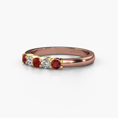 This extraordinary ring is called Yasmin 5. This type of ring is known as a memoire ring, because its gemstones are set in a continuous line. This makes it easy to combine with other rings. The band of this 14 Carat rose gold ring is set in a combination of ruby and diamond 3 mm. You can easily choose the combination you prefer online. As you can see, a single ruby is set in this single alliance rose gold ring. The memoire ring represents collaboration. And that is precisely what these gemstones do, collaborate. Together they add a beautiful effect to the band of a classic ring! Such a meaningful ring, wouldn't you agree? All our hand selected ruby are positioned by hand by our expert goldsmith. It's a precise task, which can only be completed successfully through the combination of pure craftsmanship and usage of the latest techniques which give it an optimal effect. To create a perfect reflection of light, all the gemstones have to be perfectly aligned in the same way. During manufacturing, the expert goldsmith will therefore monitor the reflection of light constantly to check whether the ruby are aligned properly. This requires a skilled hand and a lot of patience but then the end product will be a true piece of art. And that is our mission!After receiving your order, our goldsmiths will passionately start the creative process of making your ring in our own studio. Because we don't have a big stockpile, these costs will not be passed on to you. Our pricing is proof of that! We offer top quality jewels at lowest price, guaranteed.Our talented designers add new designs to our online collection daily. Together they create a diverse collection of the finest jewellery. If you prefer to make a ring according your own design, please feel free to request a quote. We will make you an amazing offer, based on quality and price.To make it easier for you, we offer a 30 day return policy. Check our terms and conditions.