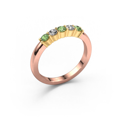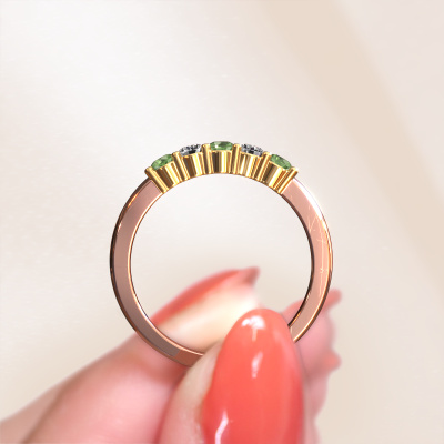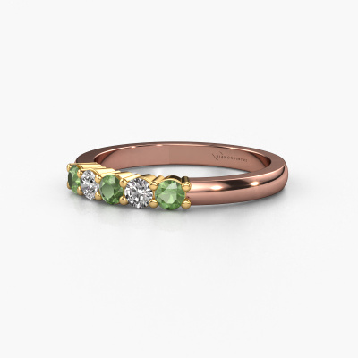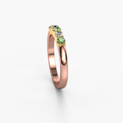 This extraordinary ring is called Yasmin 5. This type of ring is known as a memoire ring, because its gemstones are set in a continuous line. This makes it easy to combine with other rings. The band of this 14 Carat rose gold ring is set in a combination of tourmaline green and diamond 3 mm. You can easily choose the combination you prefer online. As you can see, a single tourmaline green is set in this single alliance rose gold ring. The memoire ring represents collaboration. And that is precisely what these gemstones do, collaborate. Together they add a beautiful effect to the band of a classic ring! Such a meaningful ring, wouldn't you agree? All our hand selected tourmaline green are positioned by hand by our expert goldsmith. It's a precise task, which can only be completed successfully through the combination of pure craftsmanship and usage of the latest techniques which give it an optimal effect. To create a perfect reflection of light, all the gemstones have to be perfectly aligned in the same way. During manufacturing, the expert goldsmith will therefore monitor the reflection of light constantly to check whether the tourmaline green are aligned properly. This requires a skilled hand and a lot of patience but then the end product will be a true piece of art. And that is our mission!After receiving your order, our goldsmiths will passionately start the creative process of making your ring in our own studio. Because we don't have a big stockpile, these costs will not be passed on to you. Our pricing is proof of that! We offer top quality jewels at lowest price, guaranteed.Our talented designers add new designs to our online collection daily. Together they create a diverse collection of the finest jewellery. If you prefer to make a ring according your own design, please feel free to request a quote. We will make you an amazing offer, based on quality and price.To make it easier for you, we offer a 30 day return policy. Check our terms and conditions.
