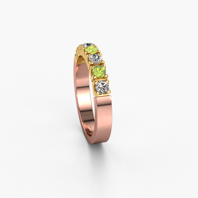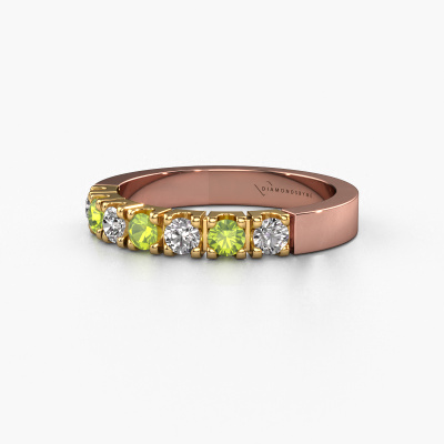 This extraordinary ring is called Dana 7. This type of ring is known as a memoire ring, because its gemstones are set in a continuous line. This makes it easy to combine with other rings. The band of this 14 Carat rose gold ring is set in a combination of peridot and lab grown diamond 3 mm. You can easily choose the combination you prefer online. As you can see, a single peridot is set in this single alliance rose gold ring. The memoire ring represents collaboration. And that is precisely what these gemstones do, collaborate. Together they add a beautiful effect to the band of a modern ring! Such a meaningful ring, wouldn't you agree? All our hand selected peridot are positioned by hand by our expert goldsmith. It's a precise task, which can only be completed successfully through the combination of pure craftsmanship and usage of the latest techniques which give it an optimal effect. To create a perfect reflection of light, all the gemstones have to be perfectly aligned in the same way. During manufacturing, the expert goldsmith will therefore monitor the reflection of light constantly to check whether the peridot are aligned properly. This requires a skilled hand and a lot of patience but then the end product will be a true piece of art. And that is our mission!After receiving your order, our goldsmiths will passionately start the creative process of making your ring in our own studio. Because we don't have a big stockpile, these costs will not be passed on to you. Our pricing is proof of that! We offer top quality jewels at lowest price, guaranteed.Our team of talented, passionate designers add new ring designs to our online collection daily. Our objective in doing so, is to be able to offer you a wide variety of jewels. Please feel free to request a quote if you have specific wishes for your ring. We guarantee to make you an offer you can't refuse.To make it easier for you, we offer a 30 day return policy. Check our terms and conditions.