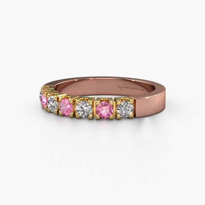 This extraordinary ring is called Dana 7. This type of ring is known as a memoire ring, because its gemstones are set in a continuous line. This makes it easy to combine with other rings. The band of this 14 Carat rose gold ring is set in a combination of pink sapphire and lab grown diamond 3 mm. You can easily choose the combination you prefer online. As you can see, a single pink sapphire is set in this single alliance rose gold ring. The memoire ring represents collaboration. And that is precisely what these gemstones do, collaborate. Together they add a beautiful effect to the band of a modern ring! Such a meaningful ring, wouldn't you agree? All our hand selected pink sapphire are positioned by hand by our expert goldsmith. It's a precise task, which can only be completed successfully through the combination of pure craftsmanship and usage of the latest techniques which give it an optimal effect. To create a perfect reflection of light, all the gemstones have to be perfectly aligned in the same way. During manufacturing, the expert goldsmith will therefore monitor the reflection of light constantly to check whether the pink sapphire are aligned properly. This requires a skilled hand and a lot of patience but then the end product will be a true piece of art. And that is our mission!After receiving your order, our goldsmiths will passionately start the creative process of making your ring in our own studio. Because we don't have a big stockpile, these costs will not be passed on to you. Our pricing is proof of that! We offer top quality jewels at lowest price, guaranteed.Our team of talented, passionate designers add new ring designs to our online collection daily. Our objective in doing so, is to be able to offer you a wide variety of jewels. Please feel free to request a quote if you have specific wishes for your ring. We guarantee to make you an offer you can't refuse.To make it easier for you, we offer a 30 day return policy. Check our terms and conditions.