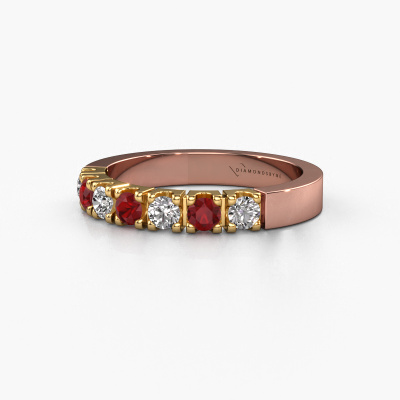 This extraordinary ring is called Dana 7. This type of ring is known as a memoire ring, because its gemstones are set in a continuous line. This makes it easy to combine with other rings. The band of this 14 Carat rose gold ring is set in a combination of ruby and lab grown diamond 3 mm. You can easily choose the combination you prefer online. As you can see, a single ruby is set in this single alliance rose gold ring. The memoire ring represents collaboration. And that is precisely what these gemstones do, collaborate. Together they add a beautiful effect to the band of a modern ring! Such a meaningful ring, wouldn't you agree? All our hand selected ruby are positioned by hand by our expert goldsmith. It's a precise task, which can only be completed successfully through the combination of pure craftsmanship and usage of the latest techniques which give it an optimal effect. To create a perfect reflection of light, all the gemstones have to be perfectly aligned in the same way. During manufacturing, the expert goldsmith will therefore monitor the reflection of light constantly to check whether the ruby are aligned properly. This requires a skilled hand and a lot of patience but then the end product will be a true piece of art. And that is our mission!After receiving your order, our goldsmiths will passionately start the creative process of making your ring in our own studio. Because we don't have a big stockpile, these costs will not be passed on to you. Our pricing is proof of that! We offer top quality jewels at lowest price, guaranteed.Our team of talented, passionate designers add new ring designs to our online collection daily. Our objective in doing so, is to be able to offer you a wide variety of jewels. Please feel free to request a quote if you have specific wishes for your ring. We guarantee to make you an offer you can't refuse.To make it easier for you, we offer a 30 day return policy. Check our terms and conditions.