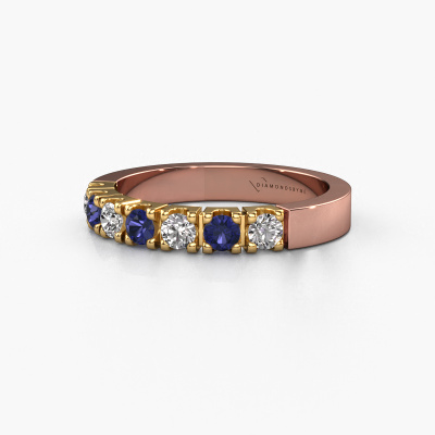 This extraordinary ring is called Dana 7. This type of ring is known as a memoire ring, because its gemstones are set in a continuous line. This makes it easy to combine with other rings. The band of this 14 Carat rose gold ring is set in a combination of sapphire and lab grown diamond 3 mm. You can easily choose the combination you prefer online. As you can see, a single sapphire is set in this single alliance rose gold ring. The memoire ring represents collaboration. And that is precisely what these gemstones do, collaborate. Together they add a beautiful effect to the band of a modern ring! Such a meaningful ring, wouldn't you agree? All our hand selected sapphire are positioned by hand by our expert goldsmith. It's a precise task, which can only be completed successfully through the combination of pure craftsmanship and usage of the latest techniques which give it an optimal effect. To create a perfect reflection of light, all the gemstones have to be perfectly aligned in the same way. During manufacturing, the expert goldsmith will therefore monitor the reflection of light constantly to check whether the sapphire are aligned properly. This requires a skilled hand and a lot of patience but then the end product will be a true piece of art. And that is our mission!After receiving your order, our goldsmiths will passionately start the creative process of making your ring in our own studio. Because we don't have a big stockpile, these costs will not be passed on to you. Our pricing is proof of that! We offer top quality jewels at lowest price, guaranteed.Our team of talented, passionate designers add new ring designs to our online collection daily. Our objective in doing so, is to be able to offer you a wide variety of jewels. Please feel free to request a quote if you have specific wishes for your ring. We guarantee to make you an offer you can't refuse.To make it easier for you, we offer a 30 day return policy. Check our terms and conditions.
