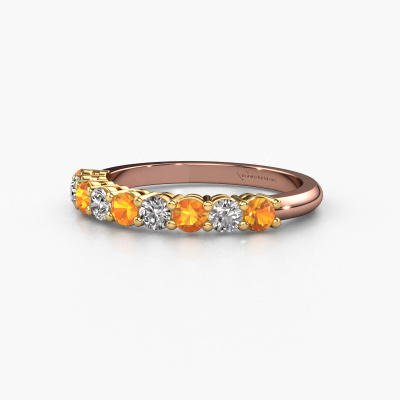 This extraordinary ring is called Michelle 9. This type of ring is known as a memoire ring, because its gemstones are set in a continuous line. This makes it easy to combine with other rings. The band of this 14 Carat rose gold ring is set in a combination of citrin and lab grown diamond 2.7 mm. You can easily choose the combination you prefer online. As you can see, a single citrin is set in this single alliance rose gold ring. The memoire ring represents collaboration. And that is precisely what these gemstones do, collaborate. Together they add a beautiful effect to the band of a classic ring! Such a meaningful ring, wouldn't you agree? All our hand selected citrin are positioned by hand by our expert goldsmith. It's a precise task, which can only be completed successfully through the combination of pure craftsmanship and usage of the latest techniques which give it an optimal effect. To create a perfect reflection of light, all the gemstones have to be perfectly aligned in the same way. During manufacturing, the expert goldsmith will therefore monitor the reflection of light constantly to check whether the citrin are aligned properly. This requires a skilled hand and a lot of patience but then the end product will be a true piece of art. And that is our mission!Because we design and deliver our own rings, we can offer you a ring at a price you won't find anywhere else. A ring is made to order, which helps prevent excess supplies, so we can make you a great price offer. We understand it feels risky, buying your ring online, but we will gladly assist in the designing process, taking your budget into consideration.Our team of talented, passionate designers add new ring designs to our online collection daily. Our objective in doing so, is to be able to offer you a wide variety of jewels. Please feel free to request a quote if you have specific wishes for your ring. We guarantee to make you an offer you can't refuse.To make it easier for you, we offer a 30 day return policy. Check our terms and conditions.