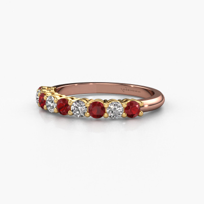 This extraordinary ring is called Michelle 9. This type of ring is known as a memoire ring, because its gemstones are set in a continuous line. This makes it easy to combine with other rings. The band of this 14 Carat rose gold ring is set in a combination of ruby and lab grown diamond 2.7 mm. You can easily choose the combination you prefer online. As you can see, a single ruby is set in this single alliance rose gold ring. The memoire ring represents collaboration. And that is precisely what these gemstones do, collaborate. Together they add a beautiful effect to the band of a classic ring! Such a meaningful ring, wouldn't you agree? All our hand selected ruby are positioned by hand by our expert goldsmith. It's a precise task, which can only be completed successfully through the combination of pure craftsmanship and usage of the latest techniques which give it an optimal effect. To create a perfect reflection of light, all the gemstones have to be perfectly aligned in the same way. During manufacturing, the expert goldsmith will therefore monitor the reflection of light constantly to check whether the ruby are aligned properly. This requires a skilled hand and a lot of patience but then the end product will be a true piece of art. And that is our mission!Because we design and deliver our own rings, we can offer you a ring at a price you won't find anywhere else. A ring is made to order, which helps prevent excess supplies, so we can make you a great price offer. We understand it feels risky, buying your ring online, but we will gladly assist in the designing process, taking your budget into consideration.Our team of talented, passionate designers add new ring designs to our online collection daily. Our objective in doing so, is to be able to offer you a wide variety of jewels. Please feel free to request a quote if you have specific wishes for your ring. We guarantee to make you an offer you can't refuse.To make it easier for you, we offer a 30 day return policy. Check our terms and conditions.