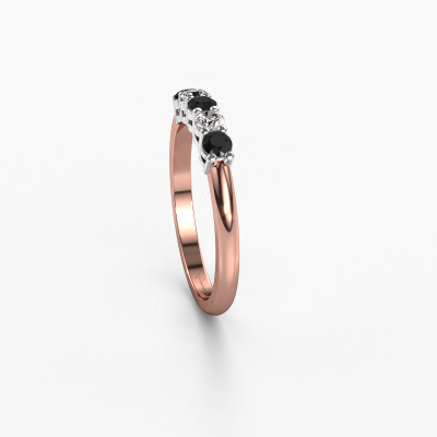 This extraordinary ring is called Michelle 5. This type of ring is known as a memoire ring, because its gemstones are set in a continuous line. This makes it easy to combine with other rings. The band of this 14 Carat rose gold ring is set in a combination of black diamond and lab grown diamond 0.56 crt. You can easily choose the combination you prefer online. As you can see, a single black diamond is set in this single alliance rose gold ring. The memoire ring represents collaboration. And that is precisely what these gemstones do, collaborate. Together they add a beautiful effect to the band of a classic ring! Such a meaningful ring, wouldn't you agree? All our hand selected black diamonds are positioned by hand by our expert goldsmith. It's a precise task, which can only be completed successfully through the combination of pure craftsmanship and usage of the latest techniques which give it an optimal effect. To create a perfect reflection of light, all the gemstones have to be perfectly aligned in the same way. During manufacturing, the expert goldsmith will therefore monitor the reflection of light constantly to check whether the black diamonds are aligned properly. This requires a skilled hand and a lot of patience but then the end product will be a true piece of art. And that is our mission!Are you on a budget? Please feel free to contact us, so we can go discuss your options. We offer our rings at guaranteed best price, because we make them to order. You won't find such a price anywhere else!