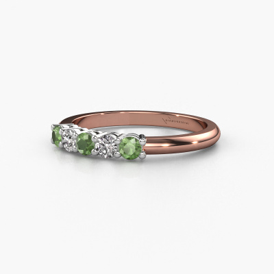 This extraordinary ring is called Michelle 5. This type of ring is known as a memoire ring, because its gemstones are set in a continuous line. This makes it easy to combine with other rings. The band of this 14 Carat rose gold ring is set in a combination of tourmaline green and lab grown diamond 3 mm. You can easily choose the combination you prefer online. As you can see, a single tourmaline green is set in this single alliance rose gold ring. The memoire ring represents collaboration. And that is precisely what these gemstones do, collaborate. Together they add a beautiful effect to the band of a classic ring! Such a meaningful ring, wouldn't you agree? All our hand selected tourmaline green are positioned by hand by our expert goldsmith. It's a precise task, which can only be completed successfully through the combination of pure craftsmanship and usage of the latest techniques which give it an optimal effect. To create a perfect reflection of light, all the gemstones have to be perfectly aligned in the same way. During manufacturing, the expert goldsmith will therefore monitor the reflection of light constantly to check whether the tourmaline green are aligned properly. This requires a skilled hand and a lot of patience but then the end product will be a true piece of art. And that is our mission!Are you on a budget? Please feel free to contact us, so we can go discuss your options. We offer our rings at guaranteed best price, because we make them to order. You won't find such a price anywhere else!