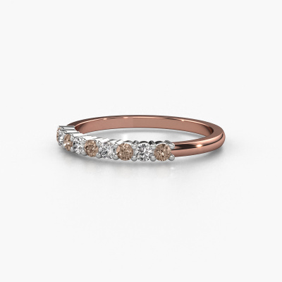 This extraordinary ring is called Yasmin 9. This type of ring is known as a memoire ring, because its gemstones are set in a continuous line. This makes it easy to combine with other rings. The band of this 14 Carat rose gold ring is set in a combination of brown diamond and diamond 0.495 crt. You can easily choose the combination you prefer online. As you can see, a single brown diamond is set in this single alliance rose gold ring. The memoire ring represents collaboration. And that is precisely what these gemstones do, collaborate. Together they add a beautiful effect to the band of a classic ring! Such a meaningful ring, wouldn't you agree? All our hand selected brown diamonds are positioned by hand by our expert goldsmith. It's a precise task, which can only be completed successfully through the combination of pure craftsmanship and usage of the latest techniques which give it an optimal effect. To create a perfect reflection of light, all the gemstones have to be perfectly aligned in the same way. During manufacturing, the expert goldsmith will therefore monitor the reflection of light constantly to check whether the brown diamonds are aligned properly. This requires a skilled hand and a lot of patience but then the end product will be a true piece of art. And that is our mission!By using a combination of the latest modern techniques, combined with ancient crafting, we can make all our rings in our own studio. Each jewel is made to order. This is advantageous because we can offer you a price you won't find anywhere else.Our team of talented, passionate designers add new ring designs to our online collection daily. Our objective in doing so, is to be able to offer you a wide variety of jewels. Please feel free to request a quote if you have specific wishes for your ring. We guarantee to make you an offer you can't refuse.To make it easier for you, we offer a 30 day return policy. Check our terms and conditions.