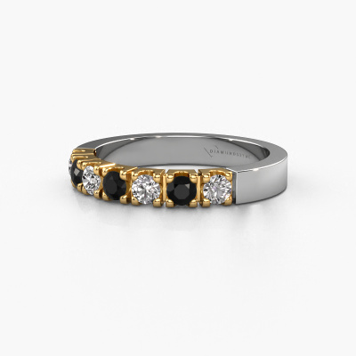 This extraordinary ring is called Dana 7. This type of ring is known as a memoire ring, because its gemstones are set in a continuous line. This makes it easy to combine with other rings. The band of this 14 Carat white gold ring is set in a combination of black diamond and lab grown diamond 0.76 crt. You can easily choose the combination you prefer online. As you can see, a single black diamond is set in this single alliance white gold ring. The memoire ring represents collaboration. And that is precisely what these gemstones do, collaborate. Together they add a beautiful effect to the band of a modern ring! Such a meaningful ring, wouldn't you agree? All our hand selected black diamonds are positioned by hand by our expert goldsmith. It's a precise task, which can only be completed successfully through the combination of pure craftsmanship and usage of the latest techniques which give it an optimal effect. To create a perfect reflection of light, all the gemstones have to be perfectly aligned in the same way. During manufacturing, the expert goldsmith will therefore monitor the reflection of light constantly to check whether the black diamonds are aligned properly. This requires a skilled hand and a lot of patience but then the end product will be a true piece of art. And that is our mission!After receiving your order, our goldsmiths will passionately start the creative process of making your ring in our own studio. Because we don't have a big stockpile, these costs will not be passed on to you. Our pricing is proof of that! We offer top quality jewels at lowest price, guaranteed.Our team of talented, passionate designers add new ring designs to our online collection daily. Our objective in doing so, is to be able to offer you a wide variety of jewels. Please feel free to request a quote if you have specific wishes for your ring. We guarantee to make you an offer you can't refuse.To make it easier for you, we offer a 30 day return policy. Check our terms and conditions.