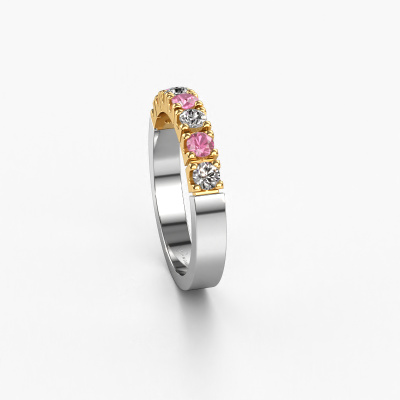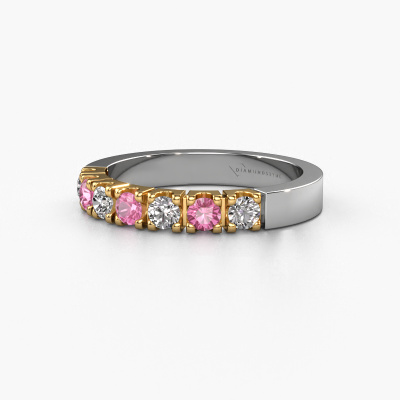 This extraordinary ring is called Dana 7. This type of ring is known as a memoire ring, because its gemstones are set in a continuous line. This makes it easy to combine with other rings. The band of this 14 Carat white gold ring is set in a combination of pink sapphire and lab grown diamond 3 mm. You can easily choose the combination you prefer online. As you can see, a single pink sapphire is set in this single alliance white gold ring. The memoire ring represents collaboration. And that is precisely what these gemstones do, collaborate. Together they add a beautiful effect to the band of a modern ring! Such a meaningful ring, wouldn't you agree? All our hand selected pink sapphire are positioned by hand by our expert goldsmith. It's a precise task, which can only be completed successfully through the combination of pure craftsmanship and usage of the latest techniques which give it an optimal effect. To create a perfect reflection of light, all the gemstones have to be perfectly aligned in the same way. During manufacturing, the expert goldsmith will therefore monitor the reflection of light constantly to check whether the pink sapphire are aligned properly. This requires a skilled hand and a lot of patience but then the end product will be a true piece of art. And that is our mission!After receiving your order, our goldsmiths will passionately start the creative process of making your ring in our own studio. Because we don't have a big stockpile, these costs will not be passed on to you. Our pricing is proof of that! We offer top quality jewels at lowest price, guaranteed.Our team of talented, passionate designers add new ring designs to our online collection daily. Our objective in doing so, is to be able to offer you a wide variety of jewels. Please feel free to request a quote if you have specific wishes for your ring. We guarantee to make you an offer you can't refuse.To make it easier for you, we offer a 30 day return policy. Check our terms and conditions.