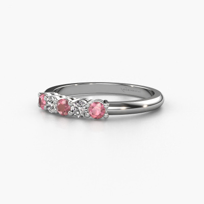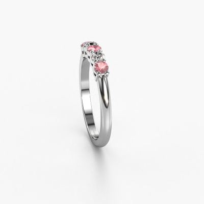 This extraordinary ring is called Michelle 5. This type of ring is known as a memoire ring, because its gemstones are set in a continuous line. This makes it easy to combine with other rings. The band of this 14 Carat white gold ring is set in a combination of tourmaline pink and lab grown diamond 3 mm. You can easily choose the combination you prefer online. As you can see, a single tourmaline pink is set in this single alliance white gold ring. The memoire ring represents collaboration. And that is precisely what these gemstones do, collaborate. Together they add a beautiful effect to the band of a classic ring! Such a meaningful ring, wouldn't you agree? All our hand selected tourmaline pink are positioned by hand by our expert goldsmith. It's a precise task, which can only be completed successfully through the combination of pure craftsmanship and usage of the latest techniques which give it an optimal effect. To create a perfect reflection of light, all the gemstones have to be perfectly aligned in the same way. During manufacturing, the expert goldsmith will therefore monitor the reflection of light constantly to check whether the tourmaline pink are aligned properly. This requires a skilled hand and a lot of patience but then the end product will be a true piece of art. And that is our mission!Are you on a budget? Please feel free to contact us, so we can go discuss your options. We offer our rings at guaranteed best price, because we make them to order. You won't find such a price anywhere else!
