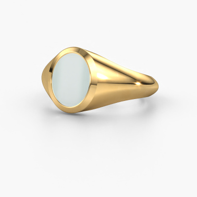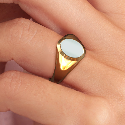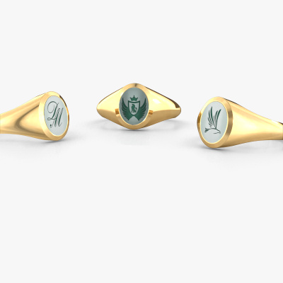 This gold women´s signet ring is a true work of art! This is our beautiful Evon 1 signet ring and it is set with a oval shape green sardonyx. In our crafting studio, we use a combination of the latest techniques and ancient traditional craftsmanship, so we are able to create a detailed perfect signet ring. Our expert goldsmiths are fascinated by signet rings. The signet ring can be engraved with initials or a family weapon. Signet rings with family weapons can be handed down from generation to generation and that usually is the case. On top of that, a signet ring is a beautiful, classy piece of jewellery which is trending once more. More than one reason to start or extend the tradition. Please browse our online database for more options on engravings. You can find the departments of our education centre at the bottom of this page. Our goldsmiths passionately create your customized signet ring to your liking with the utmost care. The gold signet ring, as shown here, can be customized using our online tool. Feel free to ask our jewel designers for assistance if you want changes made which are unavailable in our online tool. We are happy to answer your questions.After receiving your order, our goldsmiths will passionately start the creative process of making your ring in our own studio. Because we don't have a big stockpile, these costs will not be passed on to you. Our pricing is proof of that! We offer top quality jewels at lowest price, guaranteed.To make it easier for you, we offer a 30 day return policy. Check our terms and conditions.
