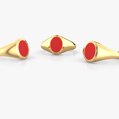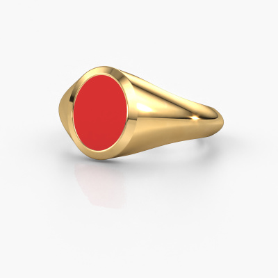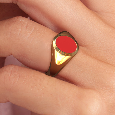 This gold women´s signet ring is a true work of art! This is our beautiful Evon 1 signet ring and it is set with a oval shape red enamel. In our crafting studio, we use a combination of the latest techniques and ancient traditional craftsmanship, so we are able to create a detailed perfect signet ring. Our expert goldsmiths are fascinated by signet rings. The signet ring can be engraved with initials or a family weapon. Signet rings with family weapons can be handed down from generation to generation and that usually is the case. On top of that, a signet ring is a beautiful, classy piece of jewellery which is trending once more. More than one reason to start or extend the tradition. Please browse our online database for more options on engravings. You can find the departments of our education centre at the bottom of this page. Our goldsmiths passionately create your customized signet ring to your liking with the utmost care. The gold signet ring, as shown here, can be customized using our online tool. Feel free to ask our jewel designers for assistance if you want changes made which are unavailable in our online tool. We are happy to answer your questions.After receiving your order, our goldsmiths will passionately start the creative process of making your ring in our own studio. Because we don't have a big stockpile, these costs will not be passed on to you. Our pricing is proof of that! We offer top quality jewels at lowest price, guaranteed.To make it easier for you, we offer a 30 day return policy. Check our terms and conditions.
