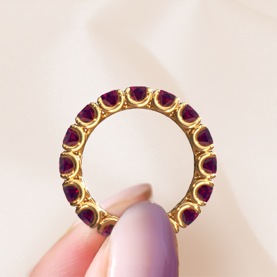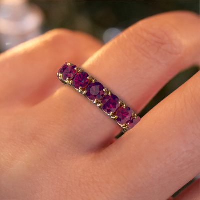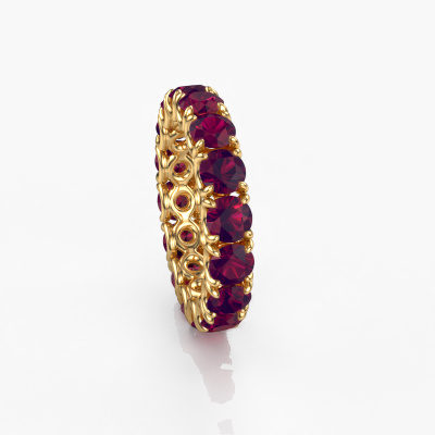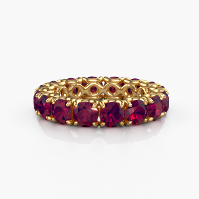 This Estee 4.2 ring in 14 Carat gold is set with rhodolite. This gold stacked Estee 4.2 ring is the perfect addition to your ring collection! As the name suggests, it is a ring which can be combined on one finger with another ring. It gives you the opportunity to create your own style. A stacked ring usually represents a certain memory of someone special or a memorable moment. It is common to combine a stacked ring, representing an anniversary, with a wedding ring. But this eternity ring, combined with your other rings, also makes a classy fashion item. The eternity Estee 4.2 ring, as shown here, can be customized to your liking. Our online tool offers many different options but please feel free to contact us if you want changes made to your Estee 4.2 ring, which are unavailable in our online tool.After receiving your order, our goldsmiths will passionately start the creative process of making your ring in our own studio. Because we don't have a big stockpile, these costs will not be passed on to you. Our pricing is proof of that! We offer top quality jewels at lowest price, guaranteed.To make it easier for you, we offer a 30 day return policy. Check our terms and conditions.