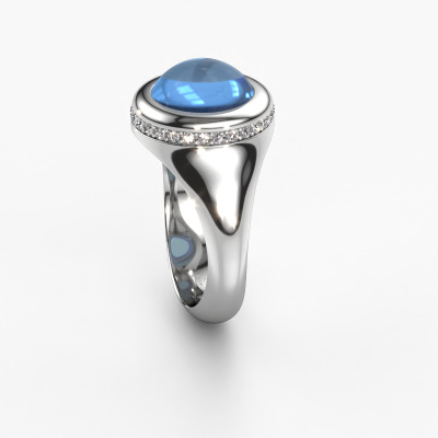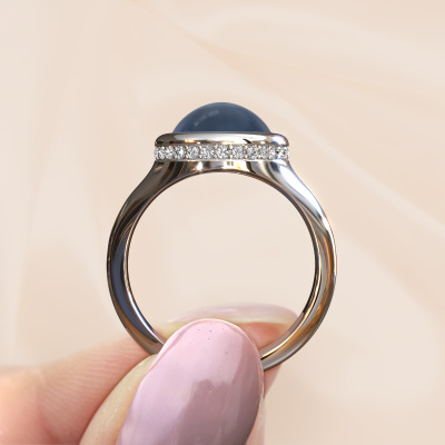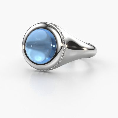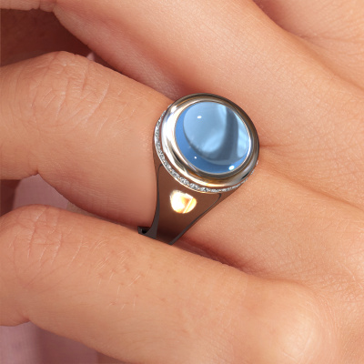 In this photo the platinum Lesli RND ring is set with a cabochon blue topaz. Cabochon means a blue topaz is shaped first, not faceted, into a specific shape, such as a drop, heart or round cabochon. Subsequently, it is polished until the gemstone has a orb shaped surface. A cabochon gemstone is a stunning, classy eye-catcher that matches perfectly with a contemporary as well as a vintage style. Our expert goldsmiths shape the beautiful ring to perfection which makes it unique. The cabochon blue topaz is set so its unique qualities are strengthened. The best part of this beautiful ring is that you can customize it to your own liking. Your style, your choice, your ring. On top of that, your modern platinum ring will be made by hand with eco-friendly materials! Please feel free to easily customize the ring, using our online tool.After receiving your order, our goldsmiths will passionately start the creative process of making your ring in our own studio. Because we don't have a big stockpile, these costs will not be passed on to you. Our pricing is proof of that! We offer top quality jewels at lowest price, guaranteed.To make it easier for you, we offer a 30 day return policy. Check our terms and conditions.