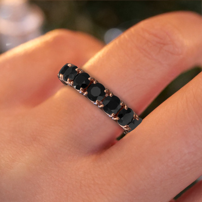 This Estee 4.2 ring in 14 Carat rose gold is set with black diamond. This rose gold stacked Estee 4.2 ring is the perfect addition to your ring collection! As the name suggests, it is a ring which can be combined on one finger with another ring. It gives you the opportunity to create your own style. A stacked ring usually represents a certain memory of someone special or a memorable moment. It is common to combine a stacked ring, representing an anniversary, with a wedding ring. But this eternity ring, combined with your other rings, also makes a classy fashion item. The eternity Estee 4.2 ring, as shown here, can be customized to your liking. Our online tool offers many different options but please feel free to contact us if you want changes made to your Estee 4.2 ring, which are unavailable in our online tool.After receiving your order, our goldsmiths will passionately start the creative process of making your ring in our own studio. Because we don't have a big stockpile, these costs will not be passed on to you. Our pricing is proof of that! We offer top quality jewels at lowest price, guaranteed.To make it easier for you, we offer a 30 day return policy. Check our terms and conditions.