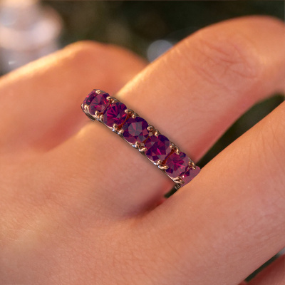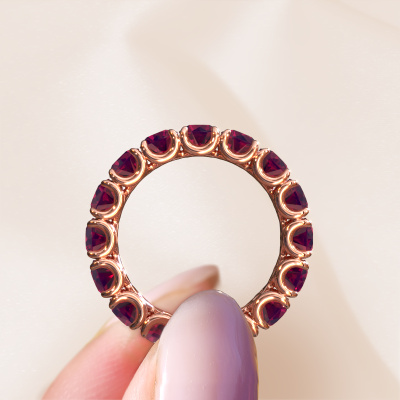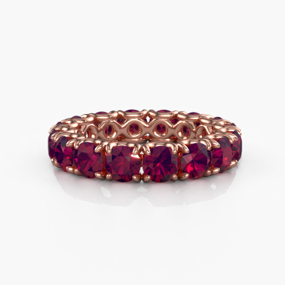 This Estee 4.2 ring in 14 Carat rose gold is set with rhodolite. This rose gold stacked Estee 4.2 ring is the perfect addition to your ring collection! As the name suggests, it is a ring which can be combined on one finger with another ring. It gives you the opportunity to create your own style. A stacked ring usually represents a certain memory of someone special or a memorable moment. It is common to combine a stacked ring, representing an anniversary, with a wedding ring. But this eternity ring, combined with your other rings, also makes a classy fashion item. The eternity Estee 4.2 ring, as shown here, can be customized to your liking. Our online tool offers many different options but please feel free to contact us if you want changes made to your Estee 4.2 ring, which are unavailable in our online tool.After receiving your order, our goldsmiths will passionately start the creative process of making your ring in our own studio. Because we don't have a big stockpile, these costs will not be passed on to you. Our pricing is proof of that! We offer top quality jewels at lowest price, guaranteed.To make it easier for you, we offer a 30 day return policy. Check our terms and conditions.