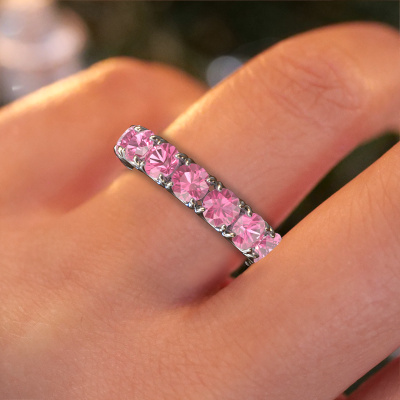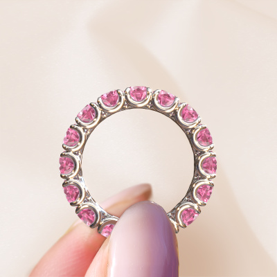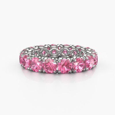 This Estee 4.2 ring in 14 Carat white gold is set with pink sapphire. This white gold stacked Estee 4.2 ring is the perfect addition to your ring collection! As the name suggests, it is a ring which can be combined on one finger with another ring. It gives you the opportunity to create your own style. A stacked ring usually represents a certain memory of someone special or a memorable moment. It is common to combine a stacked ring, representing an anniversary, with a wedding ring. But this eternity ring, combined with your other rings, also makes a classy fashion item. The eternity Estee 4.2 ring, as shown here, can be customized to your liking. Our online tool offers many different options but please feel free to contact us if you want changes made to your Estee 4.2 ring, which are unavailable in our online tool.After receiving your order, our goldsmiths will passionately start the creative process of making your ring in our own studio. Because we don't have a big stockpile, these costs will not be passed on to you. Our pricing is proof of that! We offer top quality jewels at lowest price, guaranteed.To make it easier for you, we offer a 30 day return policy. Check our terms and conditions.