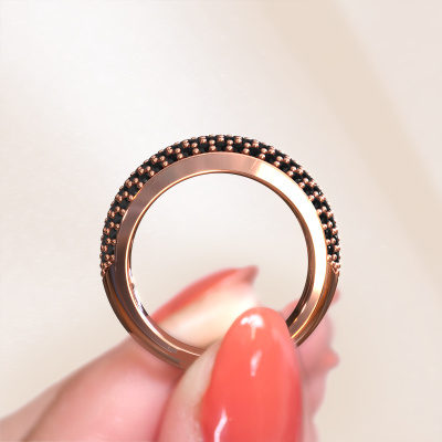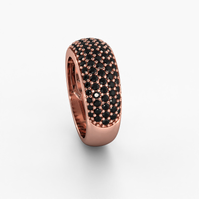 This pave set ring is called Cristy. This 14 Carat rose gold ring is set with black diamonds 1.71 crt. The band of this rose gold ring is set with rows of black diamonds which seem to have no beginning nor end. Our goldsmith carefully selects the gemstones and sets them with the utmost precision. For maximum shine, the black diamonds have to align perfectly. While artfully crafting and polishing the jewellery, light fall is constantly monitored, until the expert goldsmith is satisfied with the result. Designed by you, created especially for you!As soon as you finished designing your Cristy ring with our online tool, our goldsmiths will start their creative process of making your ring. This will be done with passion and care, according ancient crafting. On top of that, our jewels are made of eco-friendly materials. Simply customize online with our online tool, if you want any changes made. If you want specific changes made to your Cristy ring, that are unavailable in our online tool, please feel free to contact our expert designers.Because we design and deliver our own rings, we can offer you a ring at a price you won't find anywhere else. A ring is made to order, which helps prevent excess supplies, so we can make you a great price offer. We understand it feels risky, buying your ring online, but we will gladly assist in the designing process, taking your budget into consideration.To make it easier for you, we offer a 30 day return policy. Check our terms and conditions.