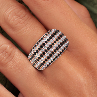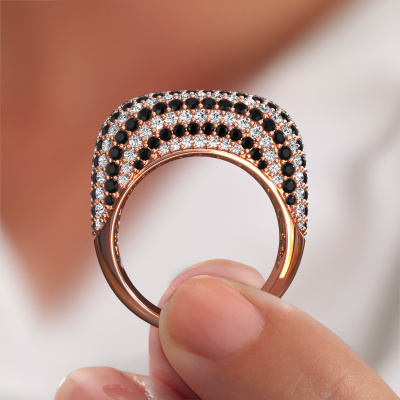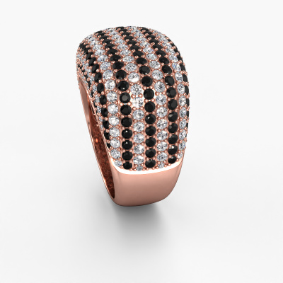 This is a stunning pavé set rose gold Kira ring. It is set with black diamond. A designer ring, fit for classy women. The ring is designed by our own expert goldsmiths. In our artisan studio, we use a combination of the latest techniques and ancient traditional craftsmanship, so we are able to create a perfectly designed ring. Our expert goldsmiths strive for perfection so they won't stop until a perfect ring, a true work of art, is created. A unique ring which matches your own style. A customized exclusive ring is the perfect gift! New exquisite designs are added daily by our team of passionate goldsmiths. And each design can be customized. Simply customize the precious metals and the colour of gemstones which will be used, for example. This makes your design of the exclusive kira ring truly unique!By using a combination of the latest modern techniques, combined with ancient crafting, we can make all our rings in our own studio. Each jewel is made to order. This is advantageous because we can offer you a price you won't find anywhere else.To make it easier for you, we offer a 30 day return policy. Check our terms and conditions.
