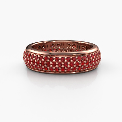 This is our Tara ring. This specific type is called an eternity ring and it is set with a continuous line of identically cut gemstones. The ring is made in 14 Carat rose gold and is set with small ruby, 1.3 mm. The amazing ruby are identical in size and are set in the ring band. Our ruby are selected with great care so they are identical, which gives the best result. In order to get the best result, our artisans position all ruby by hand with the utmost care. Our Goldsmiths have one ambition, which is creating the perfect ring. That is why we love what we do. In the end you get a stunning exclusive rose gold ring with a row of ruby which seem to have no beginning nor end. The perfect symbol of your undying love for her! How special is that!After receiving your order, our goldsmiths will start the creative process of making your Tara ring. We don't keep stock. This is advantageous because these costs will not be passed on to you. Therefore, we can offer jewellery at exceptionally low prices.
