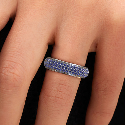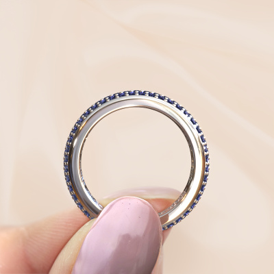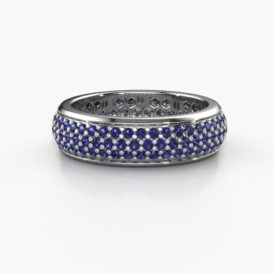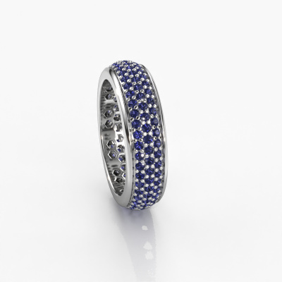 This is our Tara ring. This specific type is called an eternity ring and it is set with a continuous line of identically cut gemstones. The ring is made in 14 Carat white gold and is set with small sapphire, 1.3 mm. The amazing sapphire are identical in size and are set in the ring band. Our sapphire are selected with great care so they are identical, which gives the best result. In order to get the best result, our artisans position all sapphire by hand with the utmost care. Our Goldsmiths have one ambition, which is creating the perfect ring. That is why we love what we do. In the end you get a stunning exclusive white gold ring with a row of sapphire which seem to have no beginning nor end. The perfect symbol of your undying love for her! How special is that!After receiving your order, our goldsmiths will start the creative process of making your Tara ring. We don't keep stock. This is advantageous because these costs will not be passed on to you. Therefore, we can offer jewellery at exceptionally low prices.